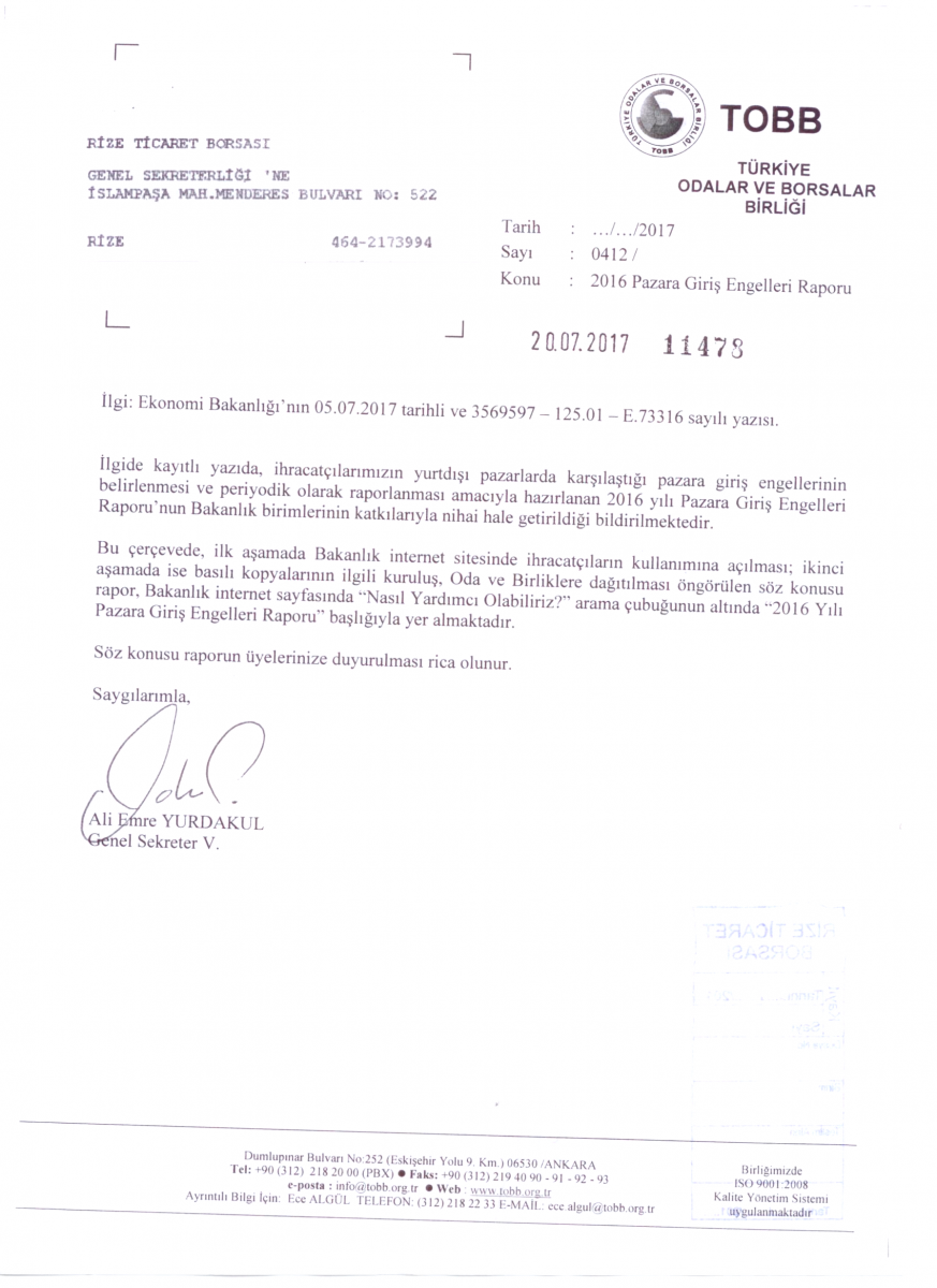 2016 Pazara Giriş Engelleri Raporu
