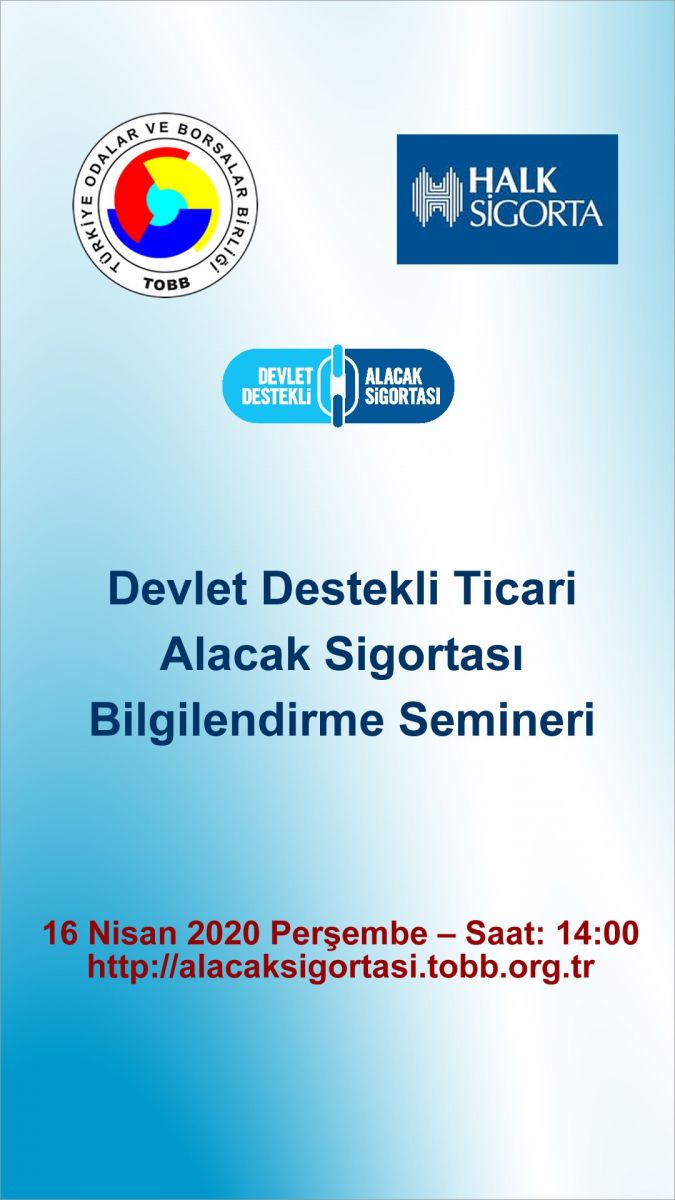TOBB ve Halk Sigorta işbirliğinde 16 Nisan 2020 Perşembe saat 14:00’te düzenlenecek “Devlet Destekli Ticari Alacak Sigortası Bilgilendirme Webinarı”na katılımınızı bekliyoruz. https://alacaksigortasi.tobb.org.tr
