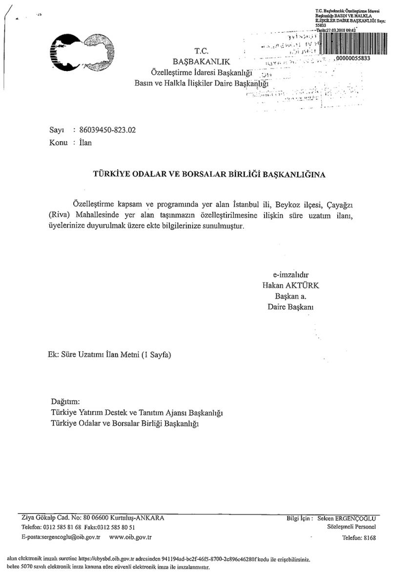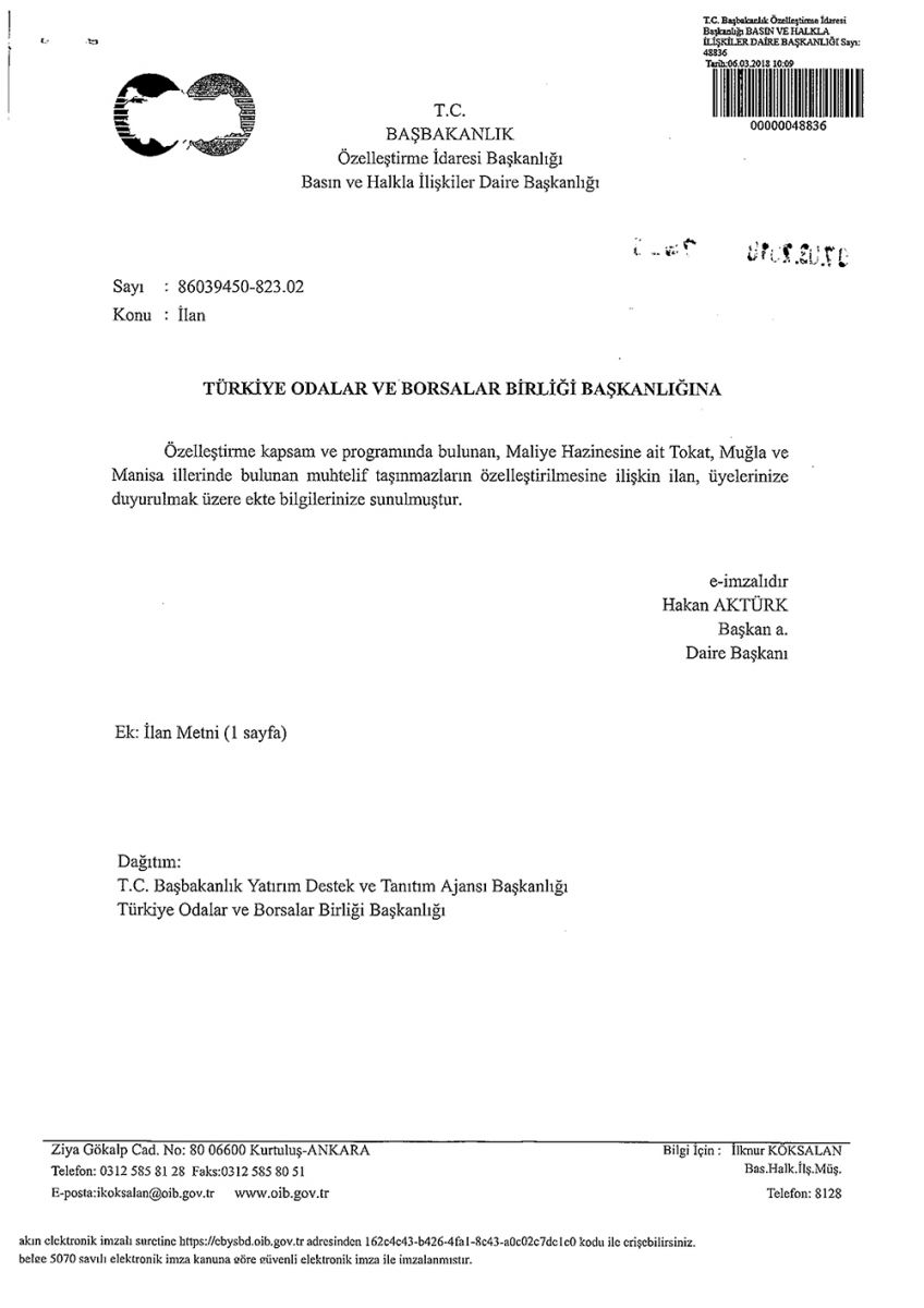 Başbakanlık Özelleştirme İdaresi Başkanlığından İlan Duyuruları