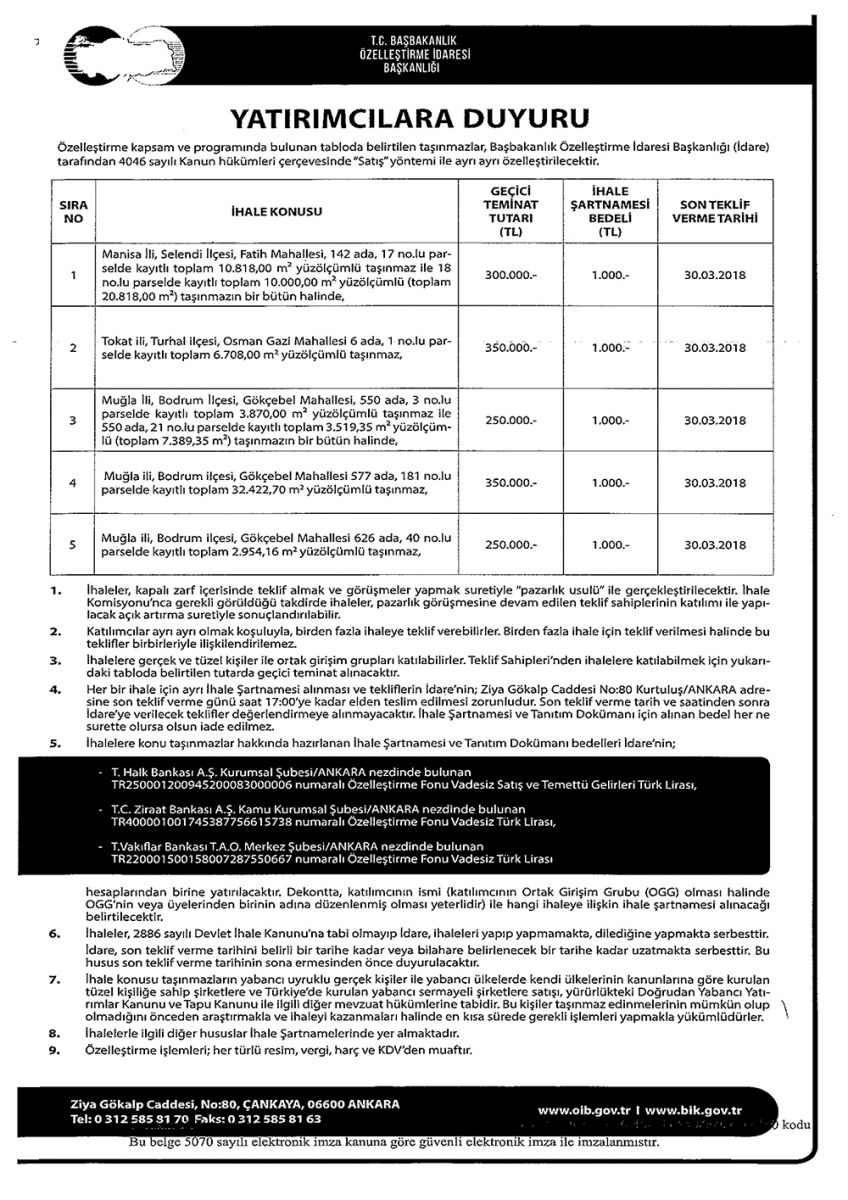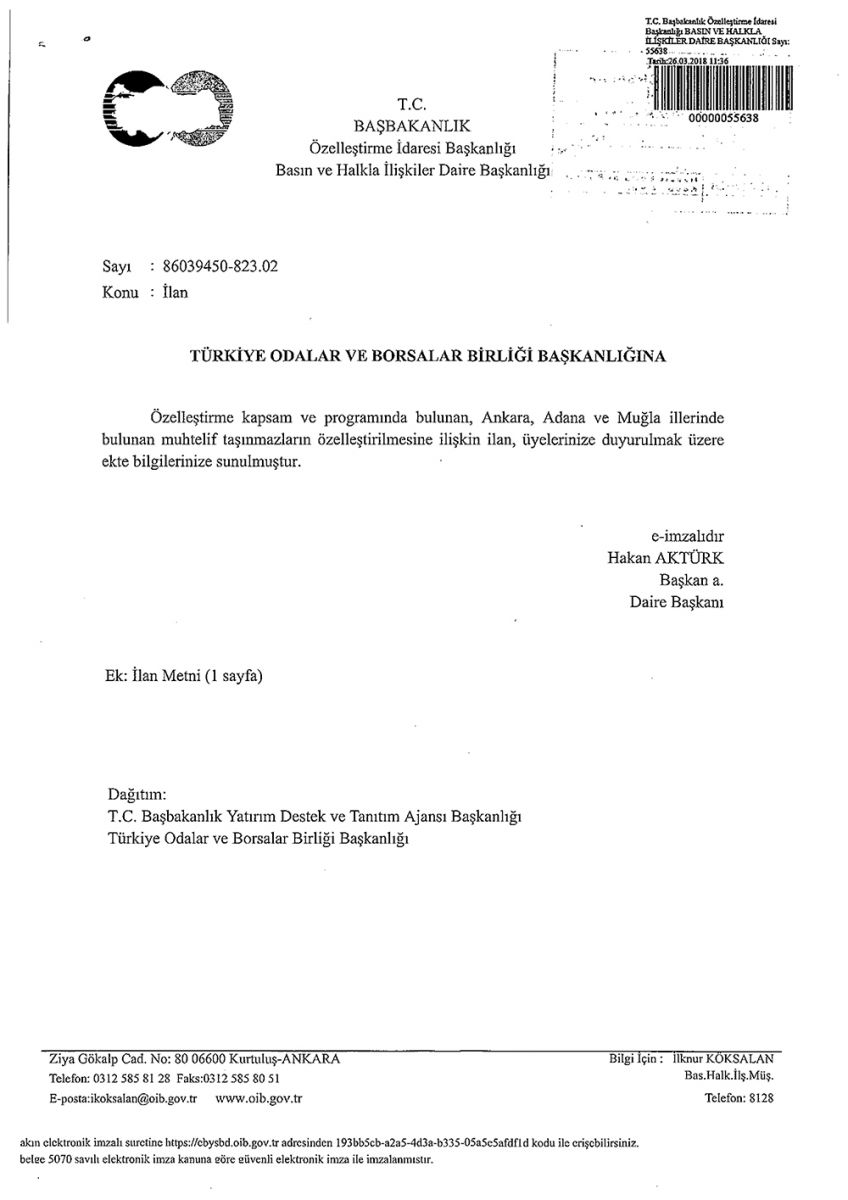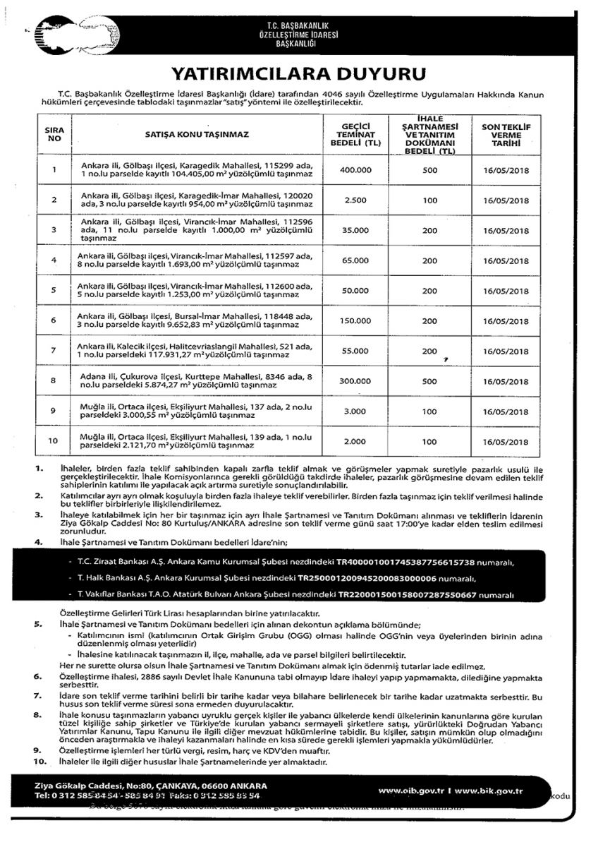 BAŞBAKANLIK ÖZELLEŞTİRME İDARESİ BAŞKANLIĞINDAN İLAN DUYURULARI