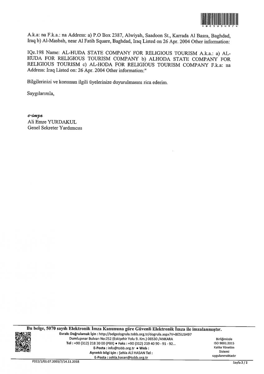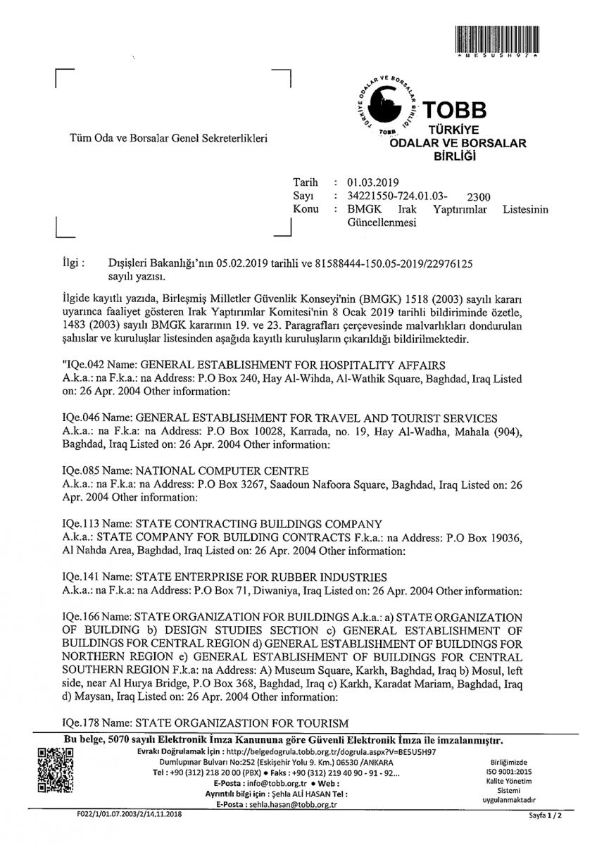 BMGK IRAK YAPTIRIMLAR LİSTESİ