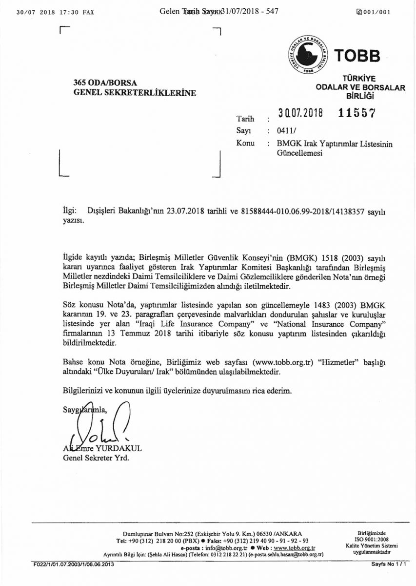BMGK Irak Yaptırımlar Listesinin Güncellemesi