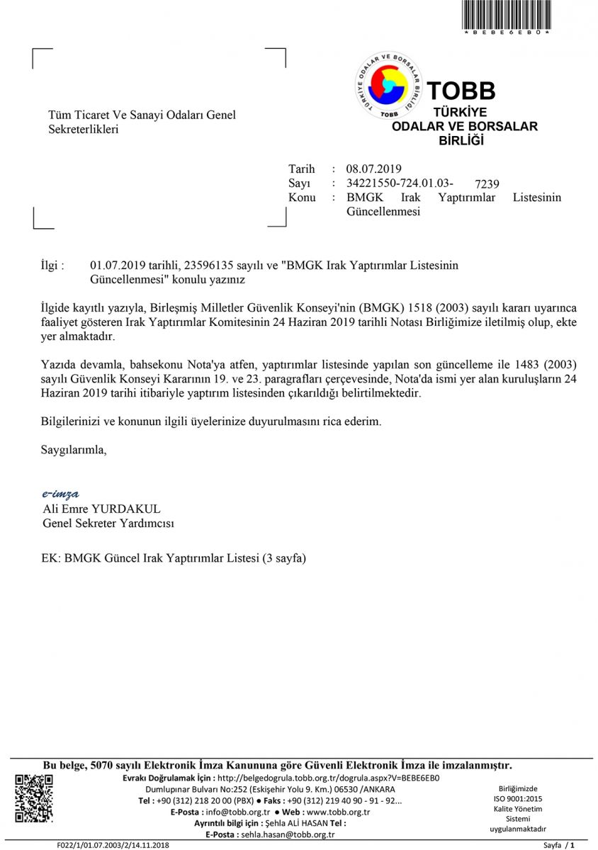 BMGK IRAK YAPTIRIMLAR LİSTESİNİN GÜNCELLENMESİ