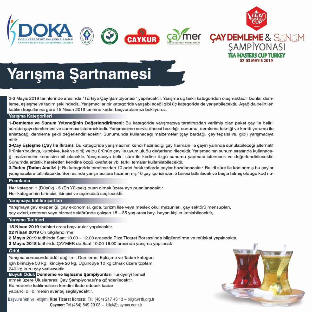 Rize Ticaret Borsası, Rize Belediyesi, ÇAYKUR ve ÇAYMER’in destekleri ve DOKA'nın finansal katkıları ile 2-3 Mayıs 2019 tarihinde Rize de “Çay Demleme ve Sunum Yarışması” yapılacaktır. Avusturalya dan Avrupa ya kadar 20 civarında çay uzmanın katılımı ile gerçekleşecek Türkiye Çay Demleme ve Sunum Yarışması’na çay uzmanlarını bekliyoruz.