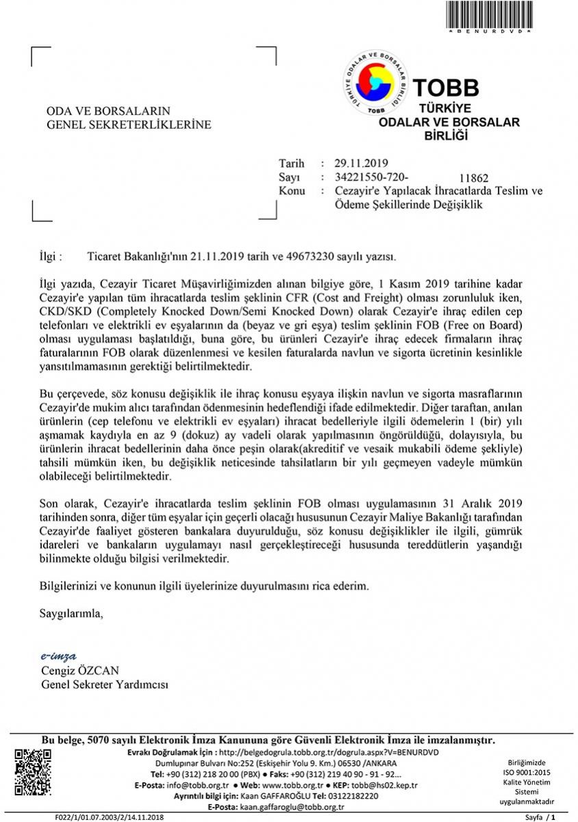 CEZAYİR'E YAPILACAK İHRACATLARDA TESLİM VE ÖDEME ŞEKİLLERİNDE DEĞİŞİKLİK