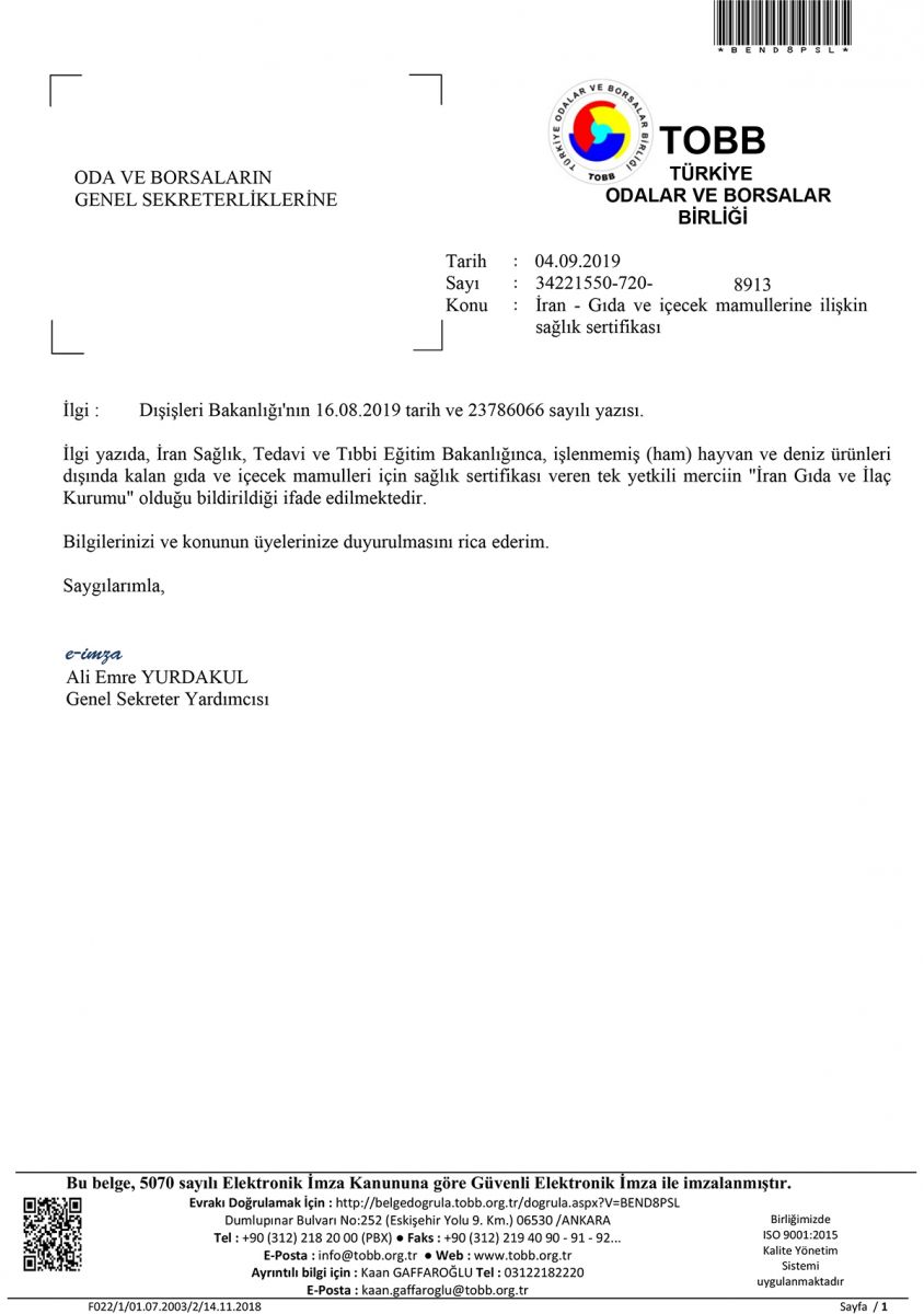 GIDA VE İÇECEK MAMULLERİNE İLİŞKİN SAĞLIK SERTİFİKASI