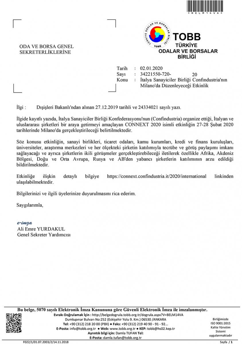 İTALYA SANAYİCİLER BİRLİĞİ CONFİNDUSTRİA'NIN MİLANO'DA DÜZENLEYECEĞİ ETKİNLİK