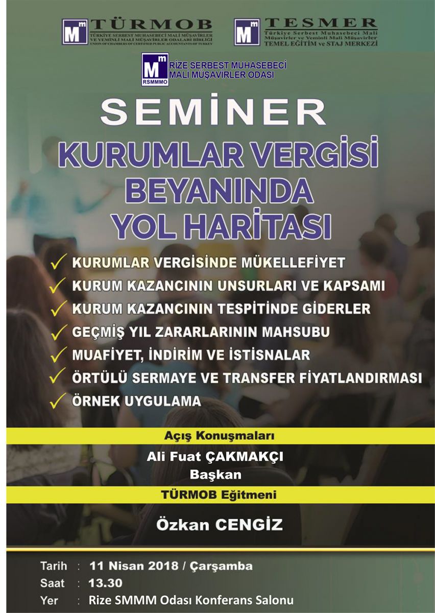 Rize Serbest Muhasebeci Mali Müşavirler Odası tarafından 11 Nisan Salı günü gerçekleşecek olan ''Kurumlar Vergisi Beyanında Yol Haritası'' konulu eğitim seminerine tüm üyelerimiz davetlidir.