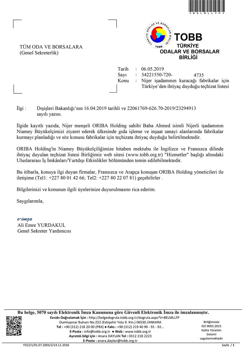 NİJER İŞADAMININ KURACAĞI FABRİKALAR İÇİN TÜRKİYE’DEN İHTİYAÇ DUYDUĞU TEÇHİZAT LİSTESİ