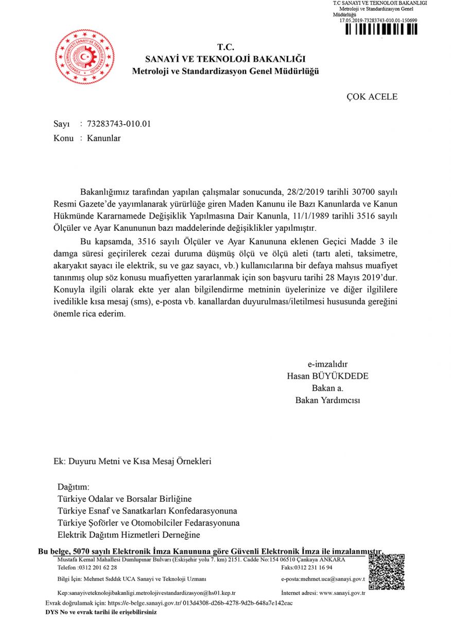 ÖLÇÜ VE TARTI ALETLERİNE GETİRİLEN MUAFİYET HAKKINDA DUYURU