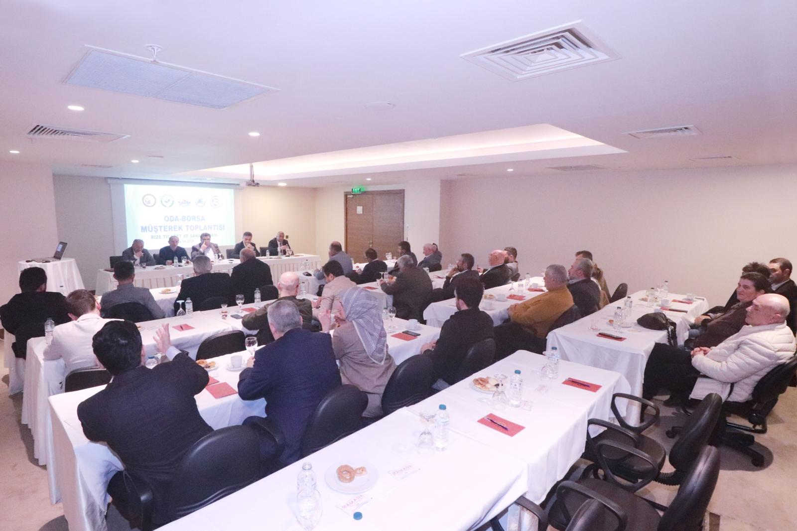 Oda Borsa Müşterek Toplantısı Rize Ticaret ve Sanayi Odası(RTSO) ev sahipliğinde Ramada Otel'de gerçekleştirildi. Toplantıda RTSO Yönetim Kurulu Başkanı Şaban Aziz Karamehmetoğlu toplantıya ev sahibi olarak başkanlık etti. Toplantıya ayrıca Rize Ticaret Borsası Başkan Yrd. Sedat Abanoz, Çayeli Ticaret ve Sanayi Odası Başkanı Mehmet Ali Mert, Pazar Ticaret ve Sanayi Odası Başkanı Nevzat Bayraktutan, Ardeşen Pazar Ticaret ve Sanayi Odası Meclis Başkanı Muhammet Mustafa Hacısüleymanoğlu ile odalar ve borsa yönetim kurulu ve meclis üyeleri ile genel sekreterler katıldı.