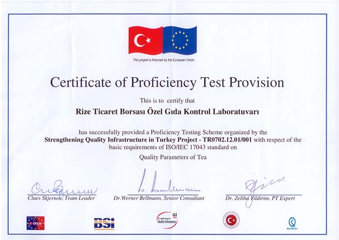 Türkiye’de Kalite Altyapısının Güçlendirilmesi Projesi (TKAG)’nin önemli bileşenlerinden birisi olan Laboratuvarlar Arası Karşılaştırma ve Yeterlilik Testleri (LAK&YT) kapsamında gerekli denetimler sonrasında laboratuvarımız “Siyah Çay Numunesinde Yeterlilik Testi Sağlayıcısı” olarak belirlenmiştir. Ülkemizde yeterlilik testi sağlayıcılığı konusunda ciddi bir açık bulunmakta ve özellikle akreditasyon sürecinde gerekli olan yeterlilik testleri için yurt dışında düzenlenen çevrimlere katılım sağlanmaktadır.