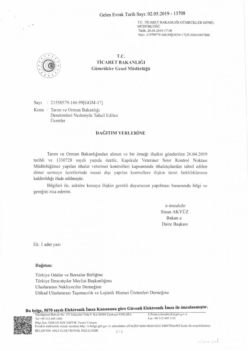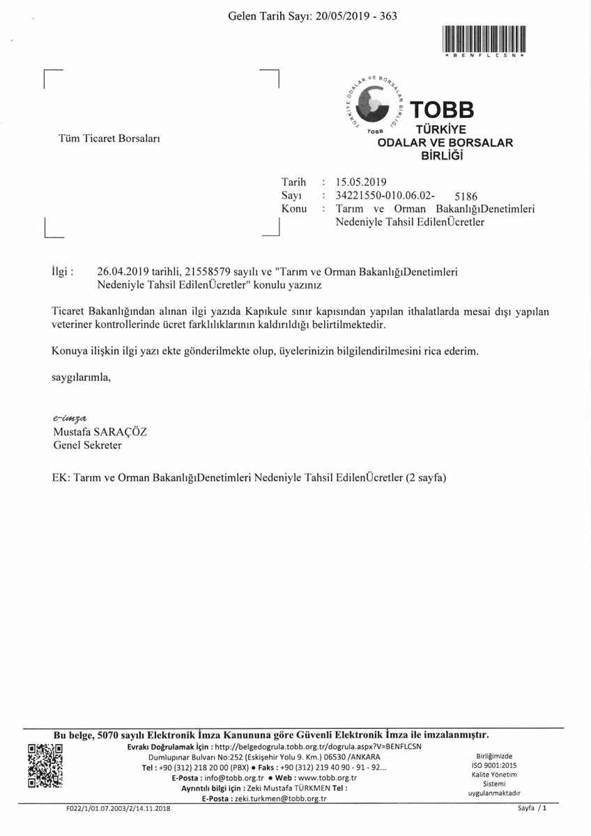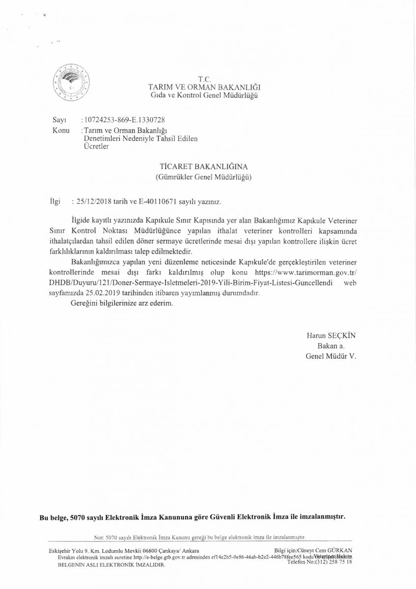Tarım ve Orman Bakanlığı Denetimleri Nedeniyle Tahsil Edilen Ücretler