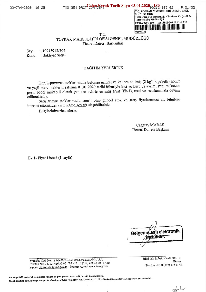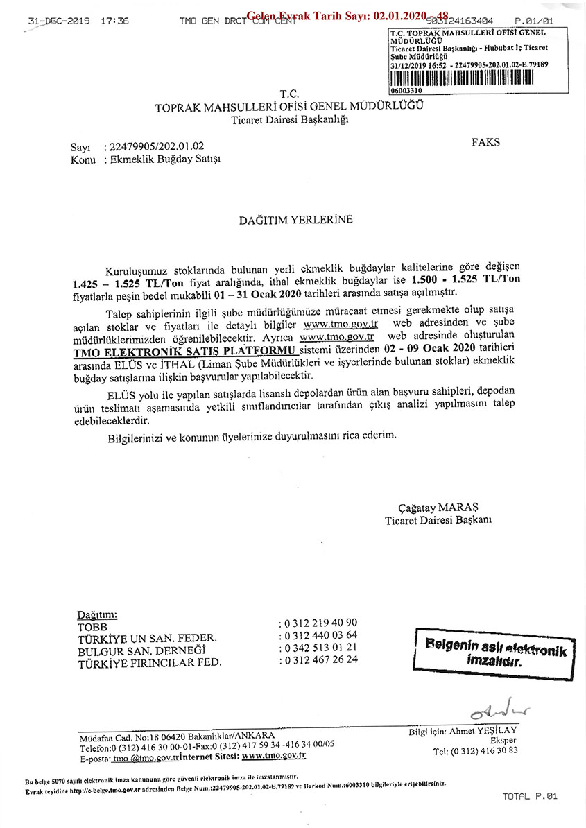 Toprak Mahsulleri Ofisi Genel Müdürlüğü’nden Birliğimize intikal eden; Ekmeklik Buğday, Makarnalık Buğday, Arpa, Mısır ve Bakliyat Satışlarına ilişkin yazılar ekte gönderilmekte olup, konunun üyelerinize duyurulması talep edilmektedir.