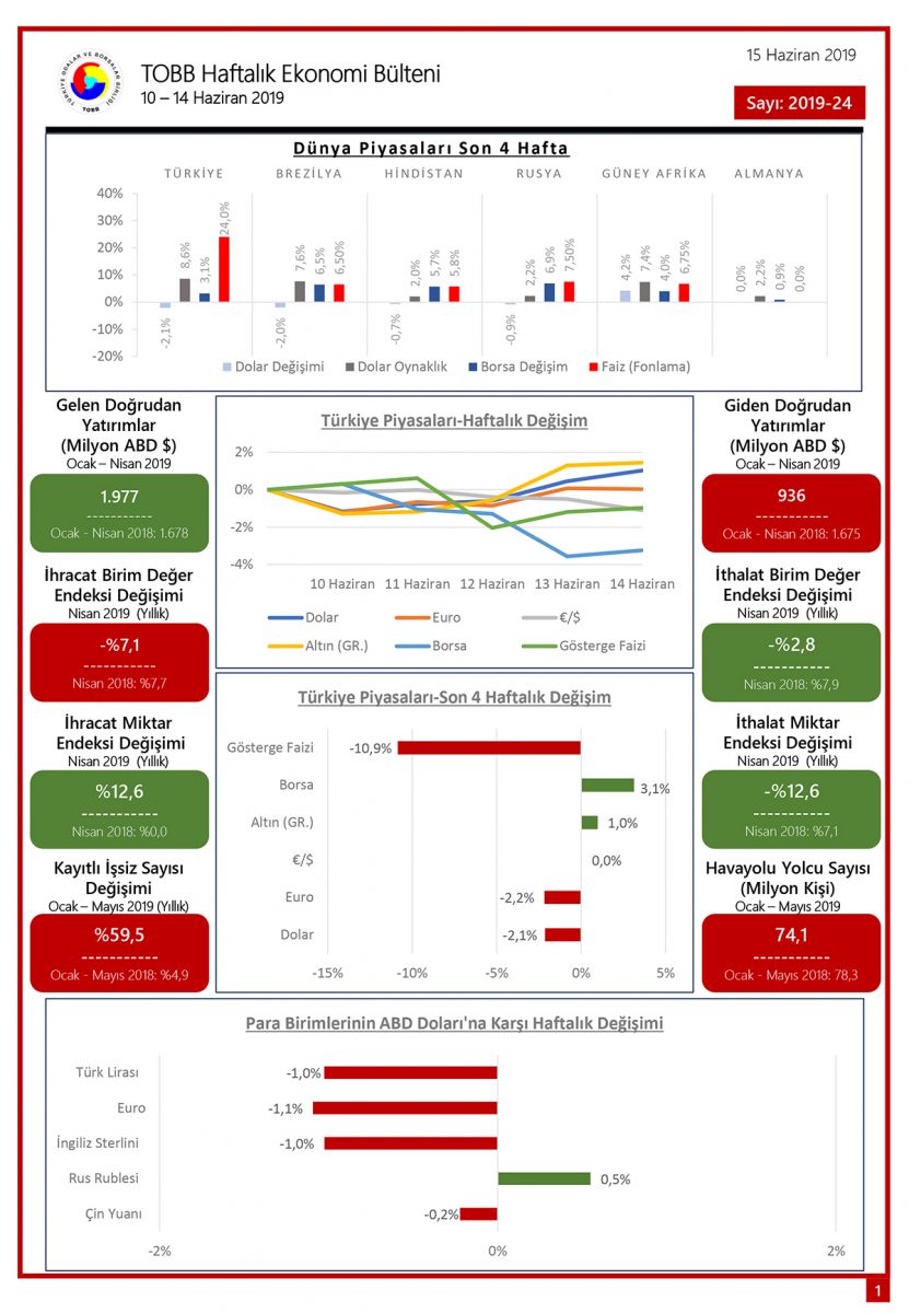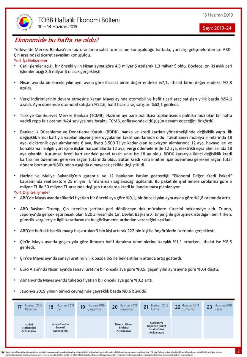 TOBB HAFTALIK EKONOMİ BÜLTENİ 10 – 14 HAZİRAN 2019