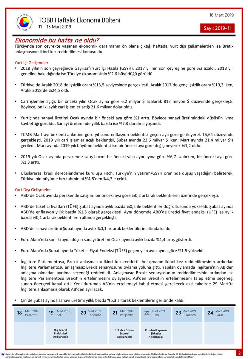 TOBB HAFTALIK EKONOMİ BÜLTENİ 11-15 MART 2019
