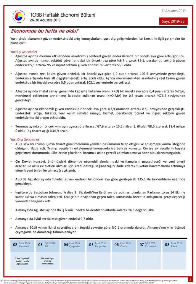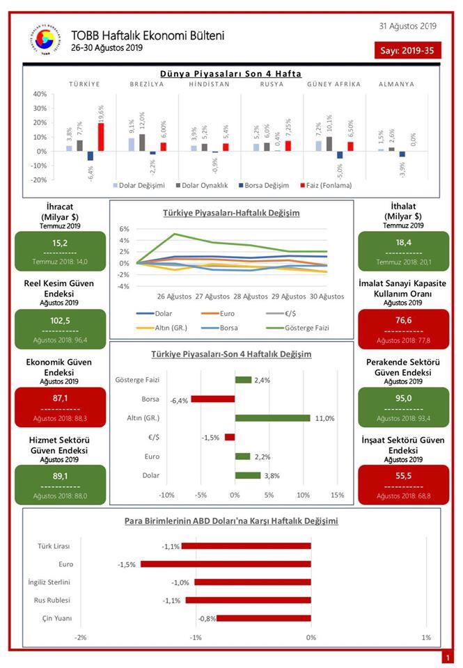 TOBB HAFTALIK EKONOMİ BÜLTENİ '26 – 30 AĞUSTOS 2019'