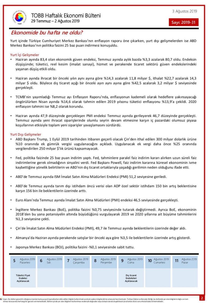 TOBB Haftalık Ekonomi Bülteni '29 Temmuz – 2 Ağustos 2019'