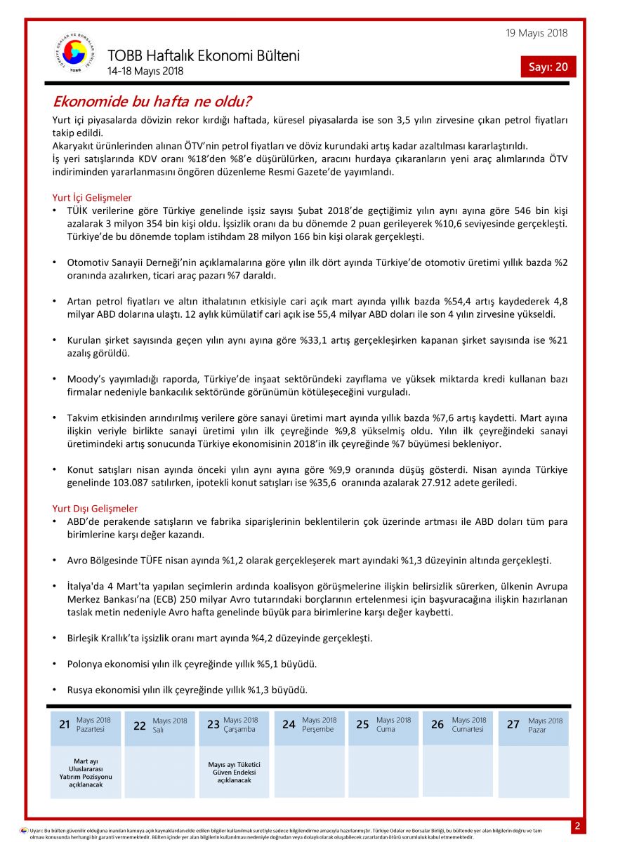TOBB HAFTALIK EKONOMİK BÜLTENİ 14-18 MAYIS 2018