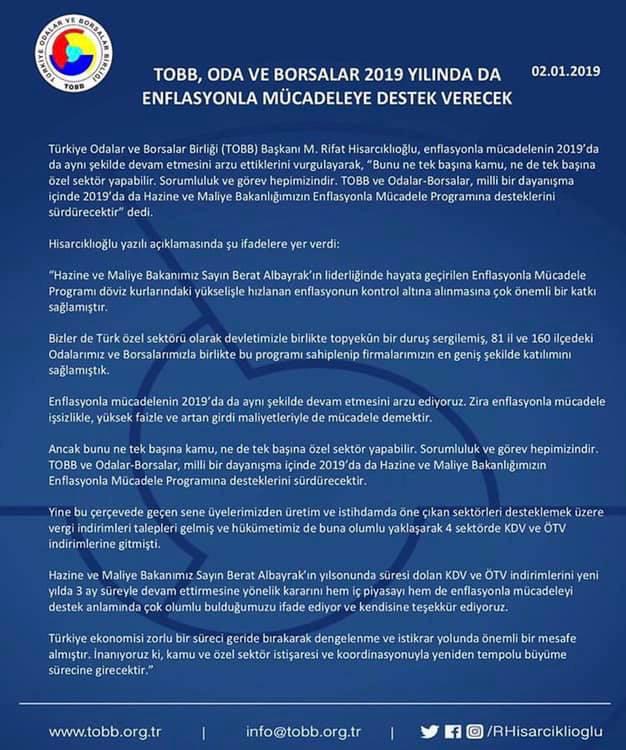 TOBB ODA VE BORSALAR 2019 YILINDA DA ENFLASYONLA MÜCADELEYE DESTEK VERECEK