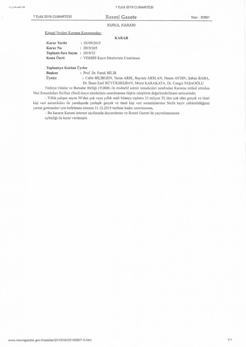 VERBİS KAYIT SÜRELERİNİN UZATILMASI HAKKINDA.
